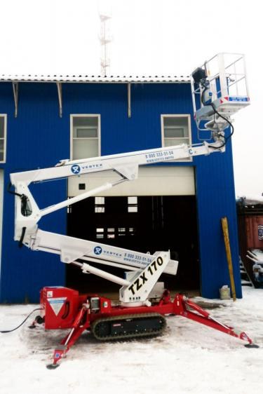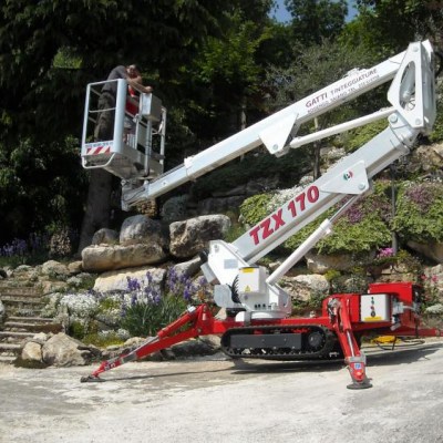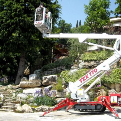 Equipped with Diesel Engine Kubota Z602 and Electric motor. Max working height 17 mt, Max outreach 7.8 mt. Boom rotation 360°, Basket rotation 90°+90°. Battery version available. Product Page: PALAZZANI TZX 170 crawler spider lift
